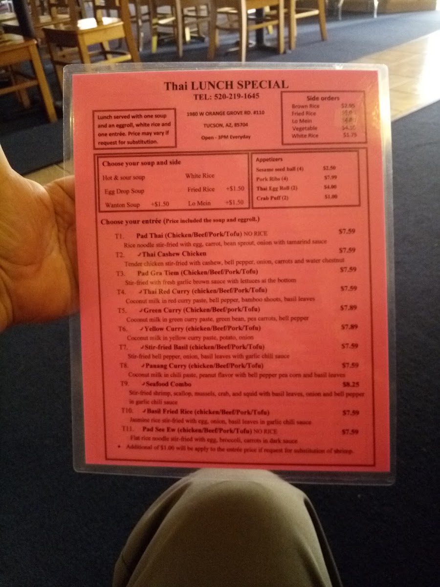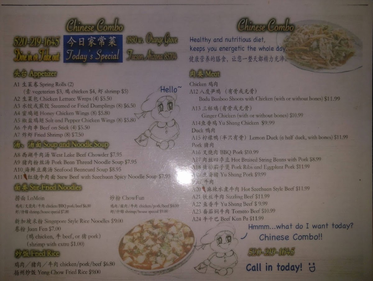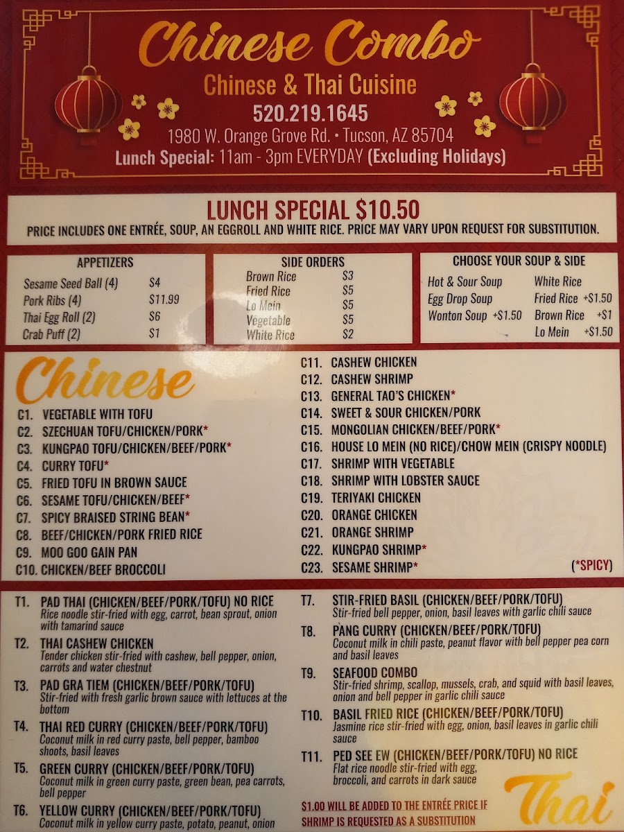 Welcome to Chinese Combo Thai Cuisine, where flavors of China and Thailand unite at 1980 W Orange Grove Rd, Tucson, AZ. Here, every dish is made fresh to order, ensuring a memorable dining experience. The menu offers a delightful blend of special Thai salads, such as the spicy Larb with a zesty lime dressing and the flavorful Beef Salad, garnished with fresh herbs and vegetables.